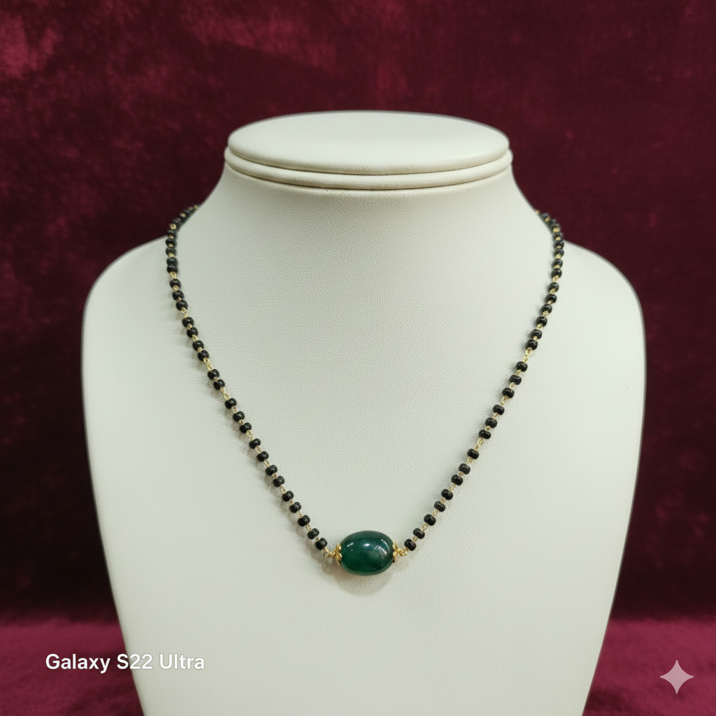 This necklace is a refined version of a traditional mangalsutra, focusing on a minimalist and elegant aesthetic.