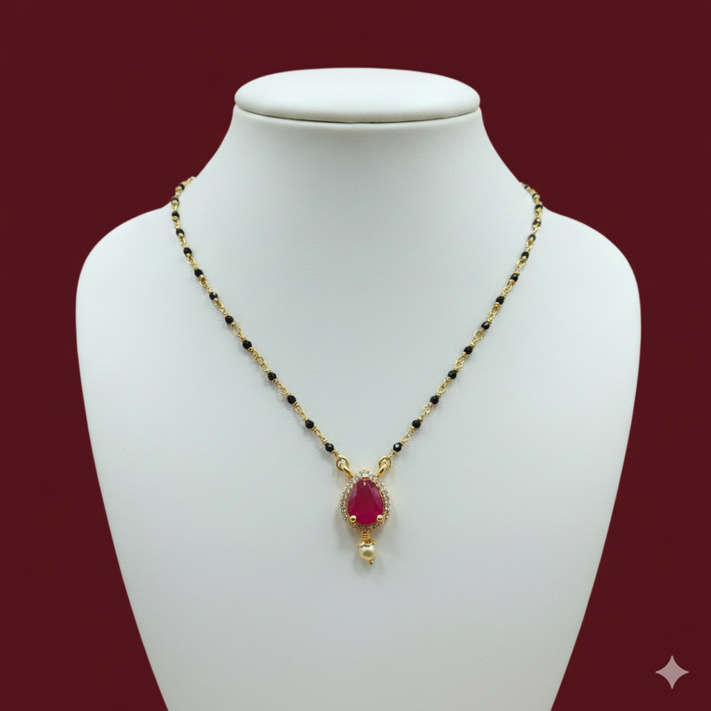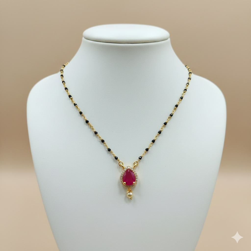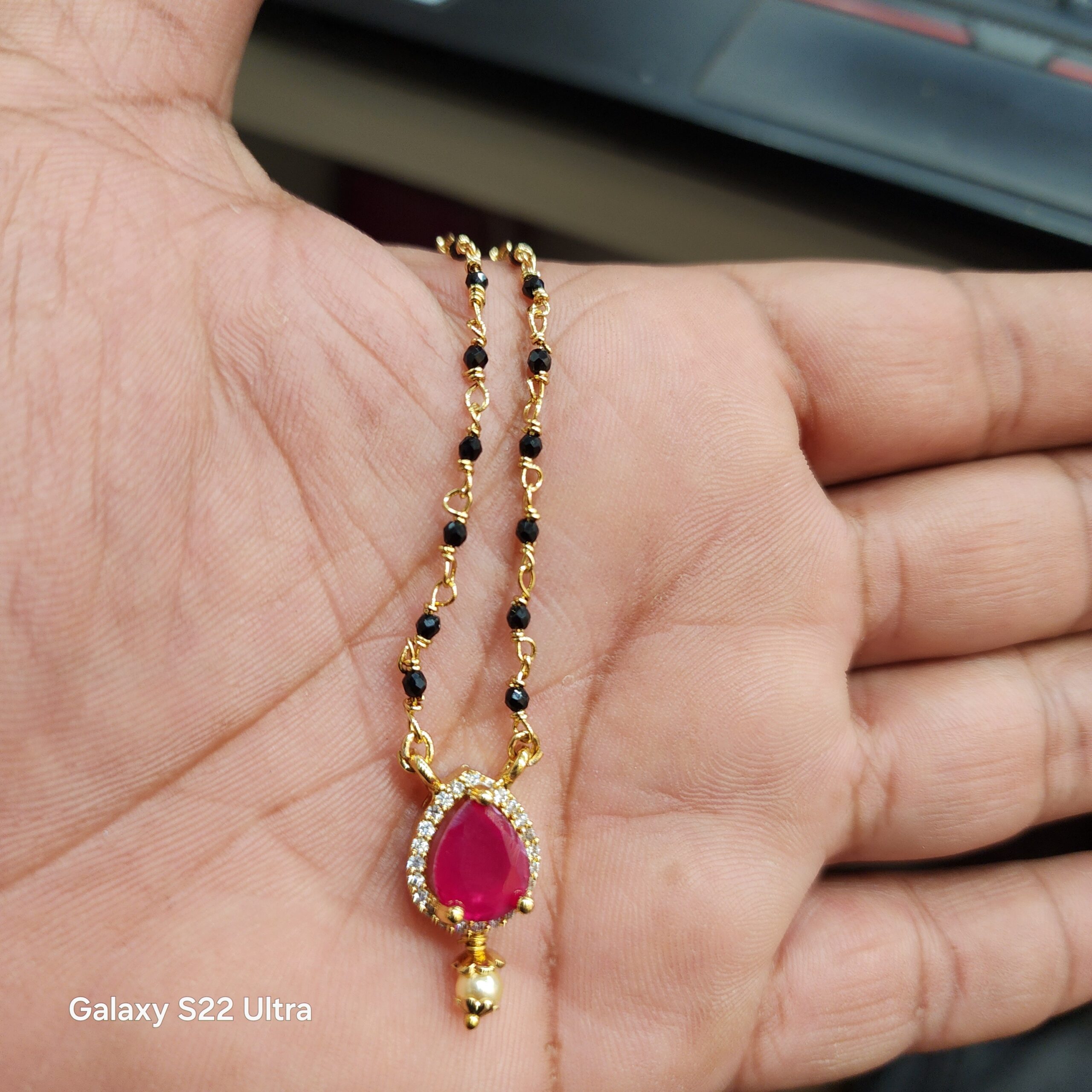 Black Beads (Mani): The necklace features small, round black beads strung along a delicate gold chain. These beads are traditionally believed to offer protection and symbolize the marital bond.