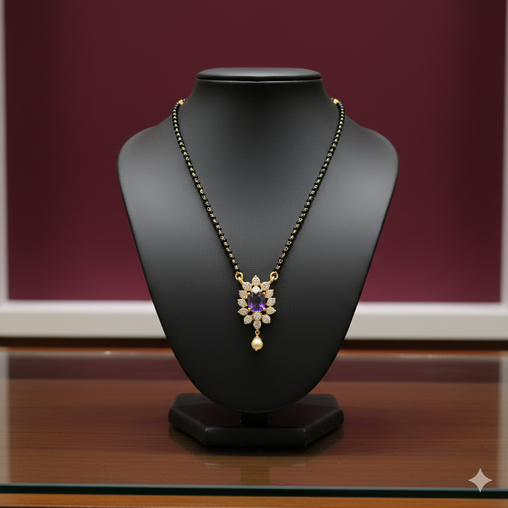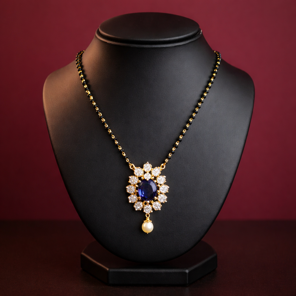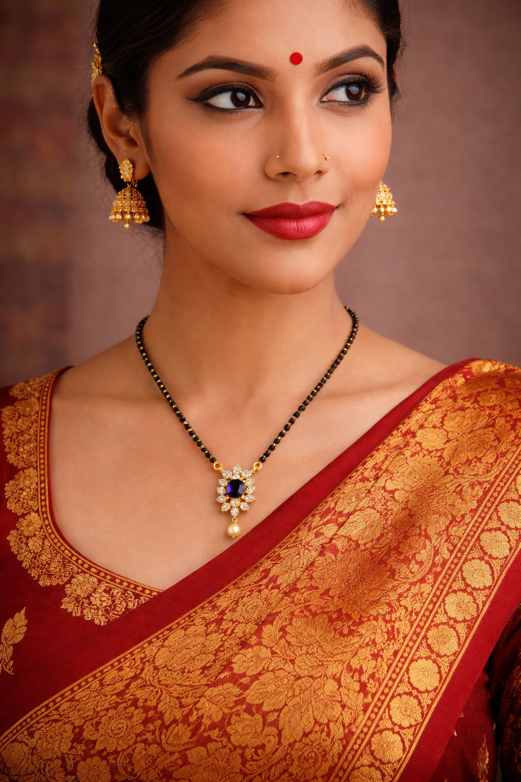 The Chain: A traditional black-beaded chain (Mangalsutra) with gold-toned accents that connect directly to the locket.